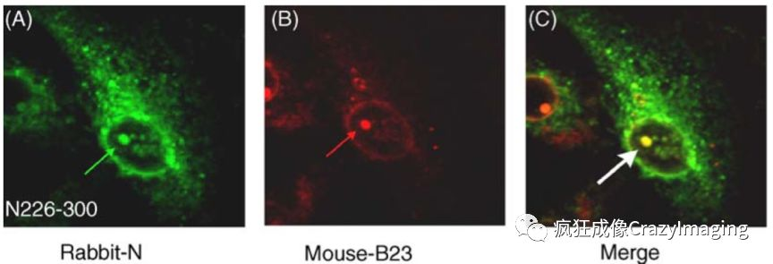 图8中,用间接免疫荧光方法和共聚焦显微镜观察到,绿色荧光标记了其结构蛋白的SARS病毒团与受感染细胞中的核蛋白(用红色荧光标记)在细胞核区共定位的情况。