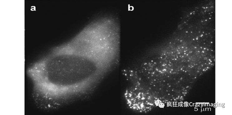 如图7,我们可以看到艾滋病病毒HIV-1(eGFP标记,图中亮点)感染活细胞25小时后在细胞中进行病毒组装的分布图(左图,宽场荧光显微镜;右图,全内反射荧光显微镜)。尽管我们在这里使用的荧光显微镜受限于分辨率极限,仍无法识别单个病毒颗粒,但是我们可以通过荧光标记物(染料或荧光蛋白)来特异性标记病毒中的某种结构蛋白,从显示荧光标记物的亮点/亮区(如图)得到宏观聚集的病毒团的分布和动态信息。
