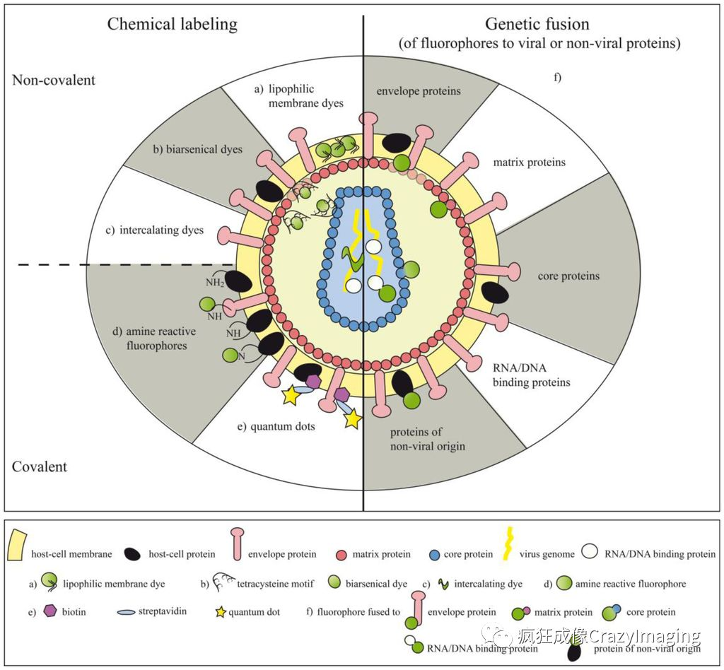 荧光标记是将病毒标记上荧光分子之后,观察可被光学显微镜分辨出的萤光团,利用荧光标记物的放大作用,来间接地观察我们看不见的病毒这样就能使病毒的感染过程可视化,就能够动态追踪病毒在细胞或宿主体内的复制、扩散等生命活动。图6展示了多种利用荧光基团来标记病毒的策略。