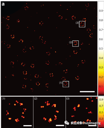 令人兴奋的是2017年初,Stefan W. Hell团队在《科学》上报道了MINFLUX超分辨率荧光显微镜,这个技术结合STED光照形式和单分子定位荧光特点,实现对生物标本的观察达到三维上小于2nm的目前最高空间分辨率(图14),已经将光学显微镜的分辨率水平提升到一般透射电镜的水平,是共聚焦显微镜的100倍,成为真正名副其实的“显纳镜”。