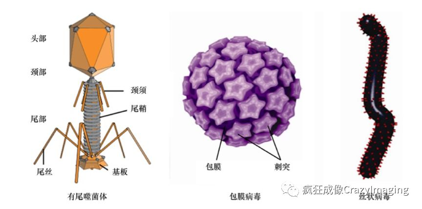 病毒是目前已知的地球上最简单的生命单元,不同于一般的细胞生物,它没有完整的细胞结构。通常它是由外壳蛋白和包被在外壳蛋白内的遗传物质(DNA或RNA,统称核酸)两部分组成。由于本身缺乏完整生命过程需要的酶系统及能量转化系统,当病毒游离于环境中时,它只是一个有机大分子,不能长时间存活,只有侵染宿主后才具有生命特征,进行复制传代。它依靠的宿主可以是简单的细菌,比如最简单、最古老的病毒叫噬菌体,它是感染细菌的病毒(图2),也可以感染人类这样复杂的生物体的细胞。病毒感染宿主细胞是一个非常复杂的过程,通俗讲,它必须寄生到一个细胞里面才能实现病毒的“传宗接代”, 如下图,病毒依靠外壳蛋白特异性结合到宿主细胞表面,注入病毒遗传物质到细胞内,利用宿主细胞来大量复制病毒遗传物质并且制造外壳蛋白,在宿主细胞内重新包装成完整病毒,然后破细胞而去进一步感染别的健康细胞,而原宿主细胞死亡。