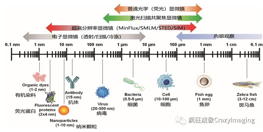 从16世纪末荷兰眼镜商人詹森父子发明世界第一台光学显微镜以来,显微镜就成为人们认识微观世界,推动生命科学进步的最主要工具。其后与牛顿同时代的英国著名科学家罗伯特胡克,以及第一个用显微镜观察到细菌等微生物的荷兰科学家列文虎克都对显微镜的制造和应用做出过极其重要的历史贡献。三百多年来随着科技进步,现代的高端宽场荧光显微镜和激光共聚焦荧光显微镜更是可以看清小至单个大细菌(1-5μm左右)和单个细胞(10-100μm左右),甚至亚细胞的尺度(图1),极大推动了现代生物医学的基础研究,做出了卓越贡献。