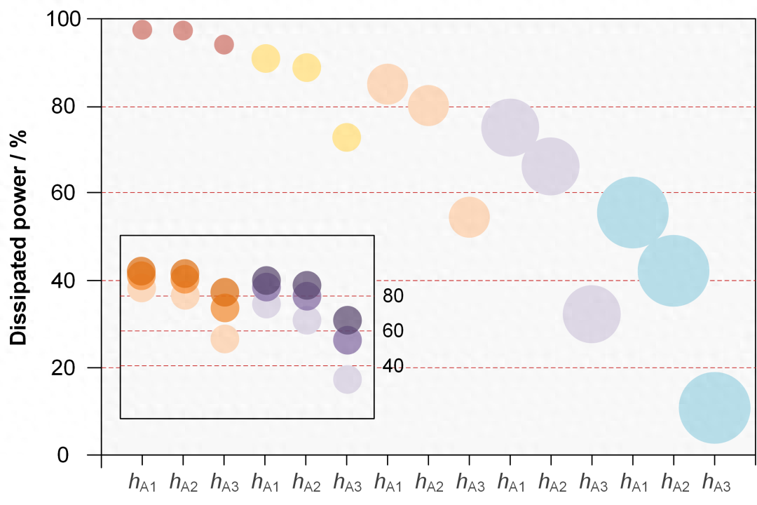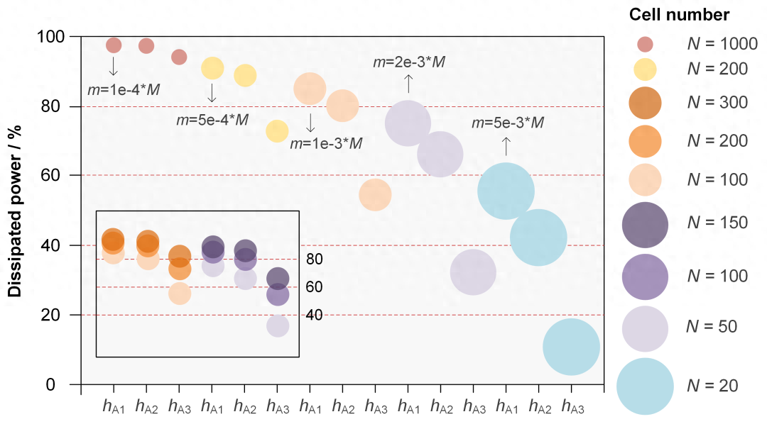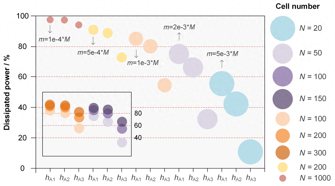 表中,单元胞质量和元胞数量是两个自变量,h1-h3是三个因变量,这个表主要表达,在总质量一定的情况下(Cell mass × Cell number = 定值),系统的三阶耗散功率是怎样的。
