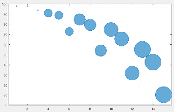 x=1:1:15;y=[97.83 97.53 93.92 91.05 88.74 72.92 84.64 79.4 54.03 74.66 65.63 31.74 55.29 42.72 10.49];z=[1 1 1 1.1 1.1 1.1 1.2 1.2 1.2 1.3 1.3 1.3 1.4 1.4 1.4];bubblechart(x,y,z)