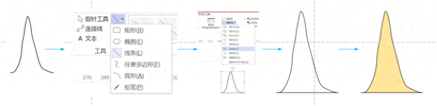 我们知道,我们是无法对一条线填充颜色的,因此我们需要将区间组合成一个曲线包围的曲面,然后对曲面进行填充颜色。那么我们如何利用Visio建立面积图形呢?我们以其中一条曲线为例,将这个曲线复制出来。然后点击线条,将曲线变成闭合的曲面,之后点击“开发工具”>“连接”,形成了一个曲面。点击“填充”。