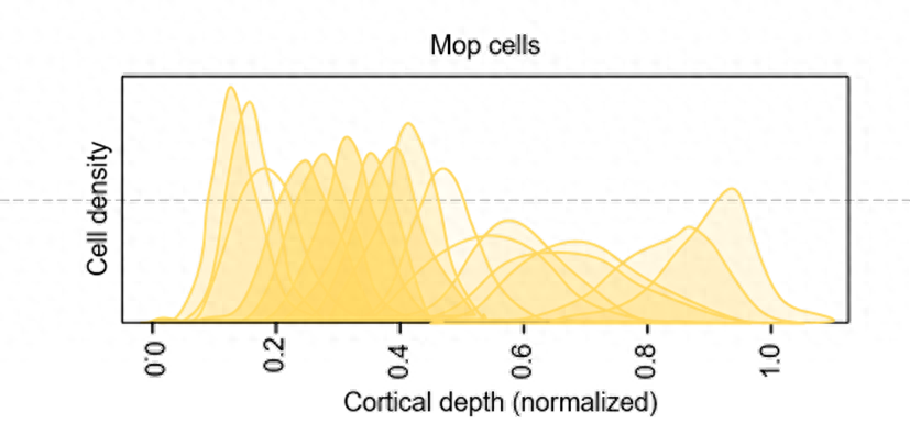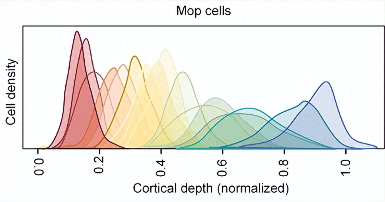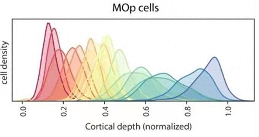 在Nature论文中发现了这样一个面积图。通过横纵坐标可以了解到这幅图主要表达的是在大脑皮层中,细胞密度随着皮层深度(cortical depth)的变化的面积图。每个深度上的细胞密度对应一个面积,面积的大小反映了该深度上的细胞密度的相对值。