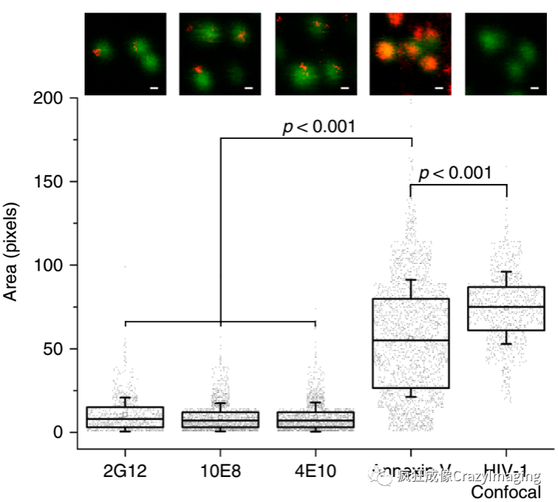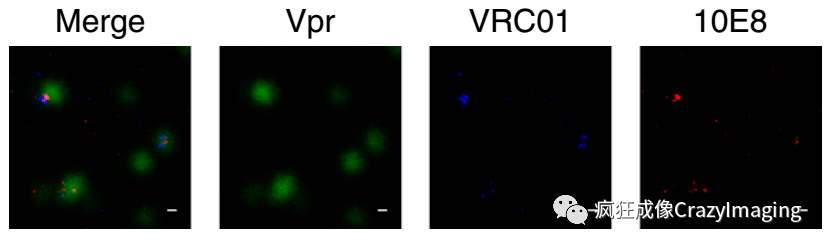 图4. STED双色共定位实验,这里只选取了一种bn抗体(10E8)的结果。