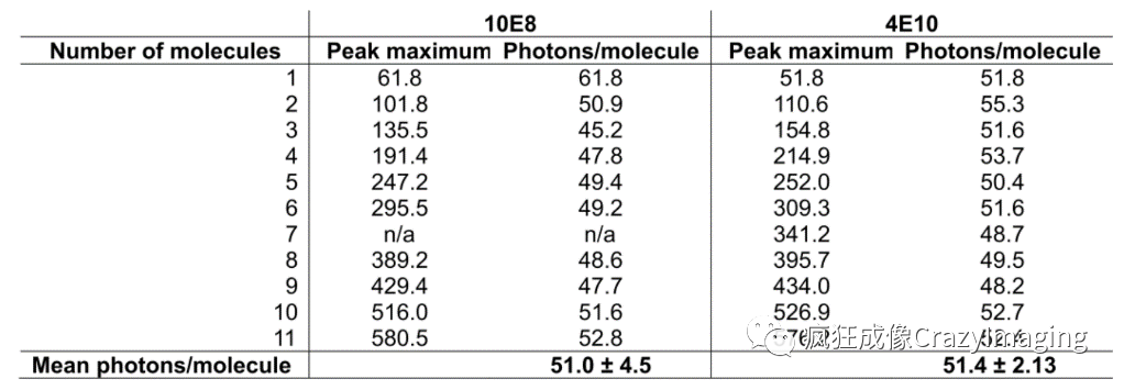 文章的主要结论至此已经很清晰了,但是在附录图表中有一个实验值得一提。在附录三中,作者计算了每个病毒颗粒结合的抗体分子数量,而这一结果得益于AI STED的一个独特优势,即他所用的检测设备是雪崩光电二极管(avalanche photodiode,APD)。APD除了量子效率远高于光电倍增管PMT以外,它的检测是直接对接收到的光子数量计数。由于每个抗体分子在一定条件下发射的荧光光子数量一定,这样经过适当的计算就可以反推得到抗体的分子数(图5)。