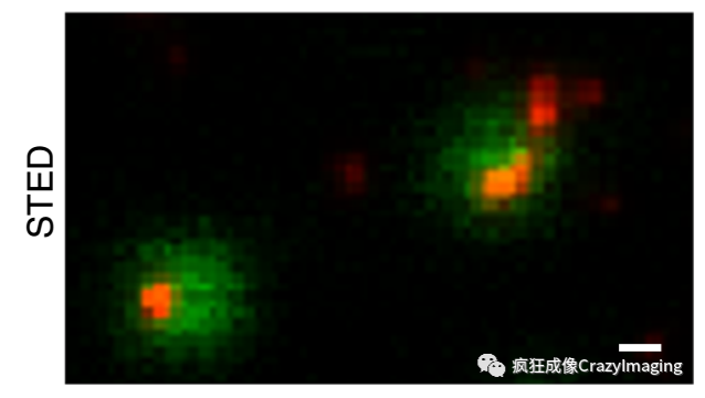 请注意,STED图里的绿色通道为共聚焦拍摄,作为对照。