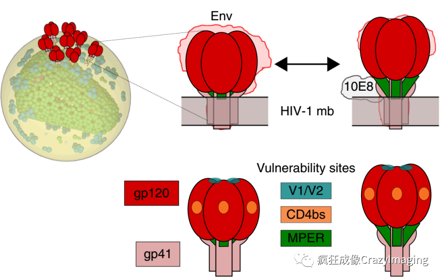 HIV-1型病毒的壳膜蛋白包含gp120和gp41,两者之间以非共价键连接(图1)。对于抗体识别来说,其中gp120的序列和修饰变异很大,作为抗原表位不够稳定,而gp41上面的MPER(membrane proximal external region)区域则相当稳定。此外上世纪九十年代以来发现的一大类高亲和力的抗体(broadly neutralizing antibodies,bn抗体)对这一区域也有很好的结合能力,因此深入了解MPER和bn抗体之间的结合机制,可以为高特异性治疗药物的设计提供很多帮助。但是MPEP这一区域位置特殊,下面紧靠病毒包膜,上部又被gp120所包绕。因此关于MPER是如何暴露出来和bn抗体结合的,一直以来有两种不同的理论:一种理论认为,bn抗体预先和病毒包膜结合,在病毒处于特定状态时才有机会和MPER结合;另一种理论认为,gp41具有多种构象,在某些构象下MPER会自发暴露出来。针对这一不同解释,之前的一些研究手段无法验证。传统的光学显微镜,包括共聚焦显微镜,其最高200nm的分辨率远达不到要求(HIV病毒颗粒只有140nm,而包被在其上的gp蛋白更是又小了一个数量级),而无论是生化手段还是电子显微镜,都需要单独分离MPER区域,无法再现MPER,特别是它和病毒包膜靠在一起时的天然状态。