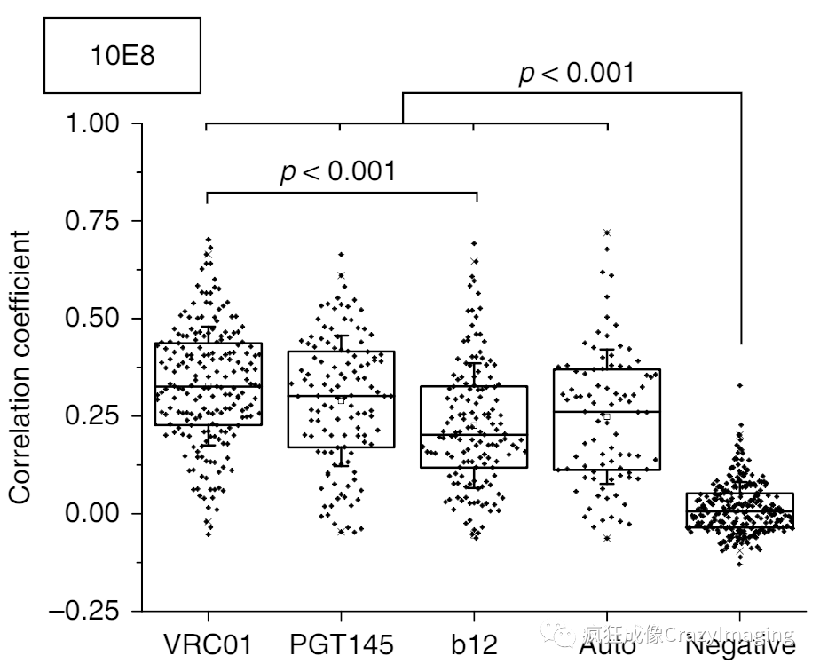 为了进一步研究bn抗体是否真的和包膜蛋白结合,作者又进行了STED双色共定位实验。在这一步中,作者建立了五组实验条件,其中VRC01,PGT145,b12三种抗体已知和gp120结合,第四组中用用两种颜色的荧光染料标记bn抗体(所以两种颜色应该永远共定位),作为阳性对照,最后一组没有使用一抗孵育,作为阴性对照。分析表明,两种bn抗体与VRC01/PGT145/b12三种抗体的共定位系数相似,和阳性对照组也处于同一水平,同时这四组的结果都显著的高于阴性对照组。这说明,bn抗体确实是和包膜蛋白相结合(图4)。当然由于分辨率所限,还不能证明bn抗体是否直接和MPER区域结合。