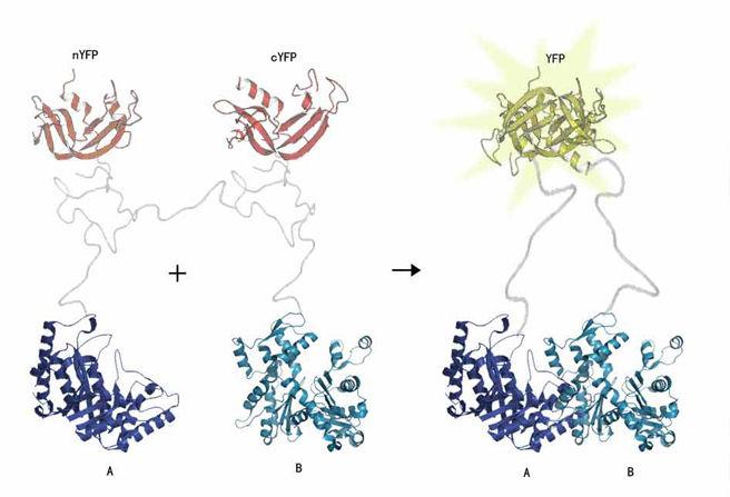同时2有个单独的名字——双分子荧光互补技术(Bimolecular fluorescence complementation,简称BiFC),将荧光蛋白分割成两个不具有荧光活性的分子片段,再分别与目标蛋白连接。若两个目标蛋白因为有相互作用而接近,就使得荧光蛋白的两个分子片段在空间上相互靠近,重新形成活性的荧光基团而发出荧光。