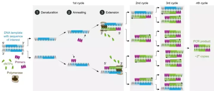 图2 PCR的基本反应步骤(图片源自:Wikipedia)。
