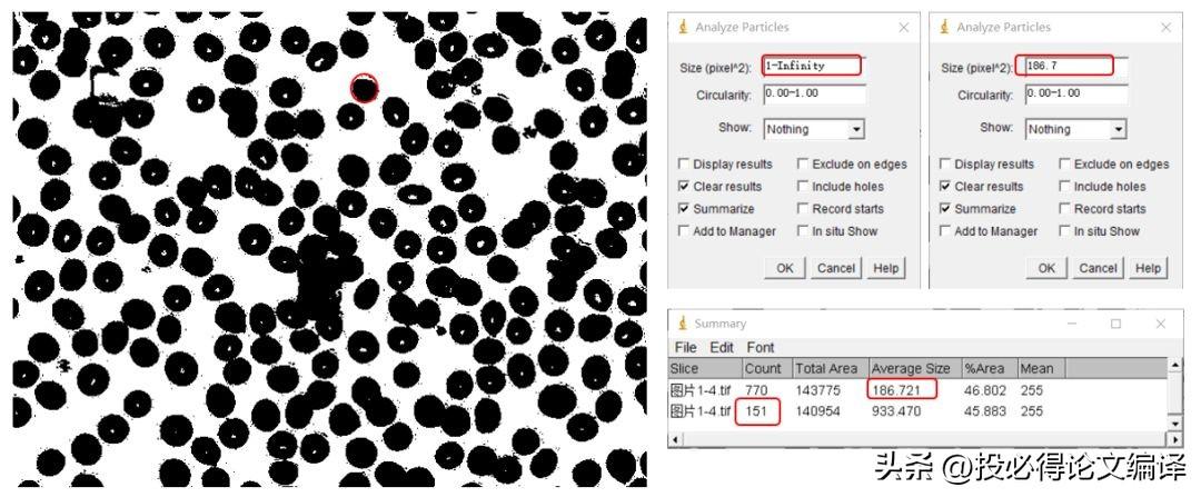 e. 得到上述图片后,先要确定图片中粒子大小,这里小编介绍一种简单办法,单击菜单【Analyze】→【Measure Panicles】,将粒子大小设置为1进行预计算,得到平均粒子大小186.7,然后以这个数值作为粒子大小重新计数,就能得到比较准确的粒子数目了。