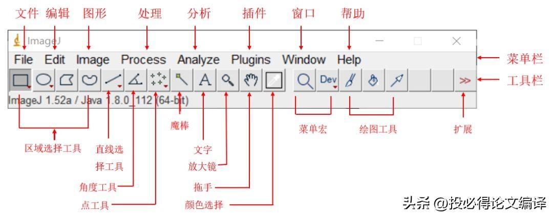 软件下载解压后可直接使用,还是先看一下ImageJ的界面,非常简洁明了,有多种图形和文字处理工具,可谓麻雀虽小五脏俱全。下面还是举例说明软件的常用功能。