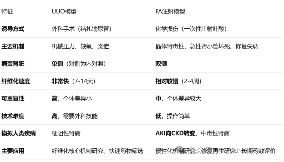 肾纤维化研究中两种最经典和常用的动物模型:单侧输尿管梗阻(UUO)模型叶酸(FA)注射模型。这两种模型通过不同的机制诱导肾纤维化,各有其优缺点和适用场景,是研究肾纤维化发病机制和药物干预效果的强大工具。