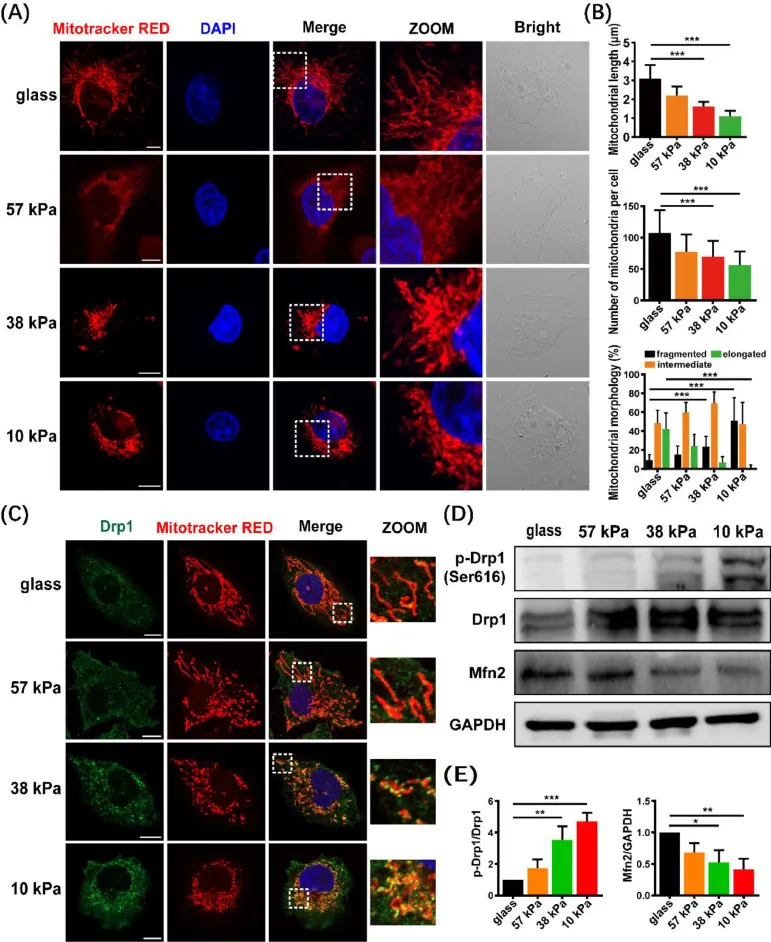 在本研究中,研究人员使用不同刚度的PAA凝胶基底来模拟乳腺癌的不同进展阶段,玻璃基团作为对照。利用MitoTracker Red探针对细胞内线粒体进行染色,以评估基质刚度对线粒体形态的影响,结果显示软基质中的线粒体碎裂增加(图5A-B)。为了验证该裂变是否与Drp1相关,研究人员进行了共定位实验,结果显示软底物诱导更多的细胞在线粒体上招募内源性Drp1,促进线粒体碎裂(图5C)。