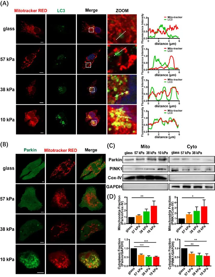 图6 软底物促进了MDA-MB-231细胞中的线粒体吞噬。(A)在不同硬度的基底上培养的MDA-MB-231细胞的代表性共聚焦图像(左)。细胞用抗lc3抗体(绿色)、丝裂体追踪器红色(红色)和DAPI(蓝色)染色。虚线中线粒体和LC3的径向荧光强度曲线(右)。(B)GFP-Parkin转染后的Parkin(绿色)和线粒体(红色)的代表性图像。(C)对线粒体或细胞质部分的Parkin和PINK1的免疫印迹分析。(D)蛋白表达的定量分析(n = 3)。