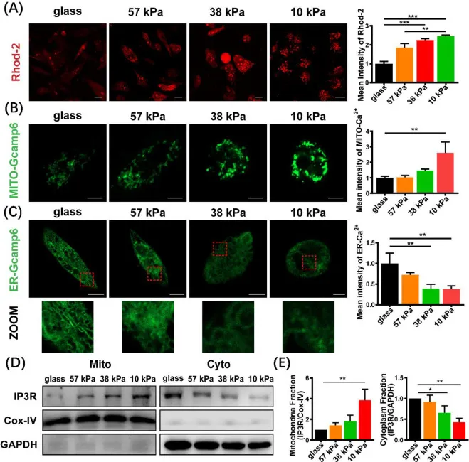 图8 软底物增强了内质网对线粒体Ca2+的摄取。(A)在不同硬度的基质上培养的MDA-MB-231细胞中线粒体钙的代表性共聚焦图像(左)和相应的平均荧光强度的定量。(B和C)转染Mito-Gcamp6或ER-Gcamp6 24小时的细胞中线粒体和内质网钙的代表性显微照片(左)和相应的平均荧光强度的定量。底部的面板显示了盒子区域的放大倍数。比例尺= 10 μm。(D)免疫blot分析线粒体或细胞质组分中的IP3R。(E)用ImageJ软件进行定量(n = 3)。