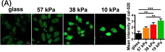 图7 软底物增加了Ca2+的浓度和振荡。(A)在不同硬度的基质上培养的MDA-MB-231细胞中胞质钙的代表性图像(左)和相应的平均荧光强度的定量图像(右,n = 3)。