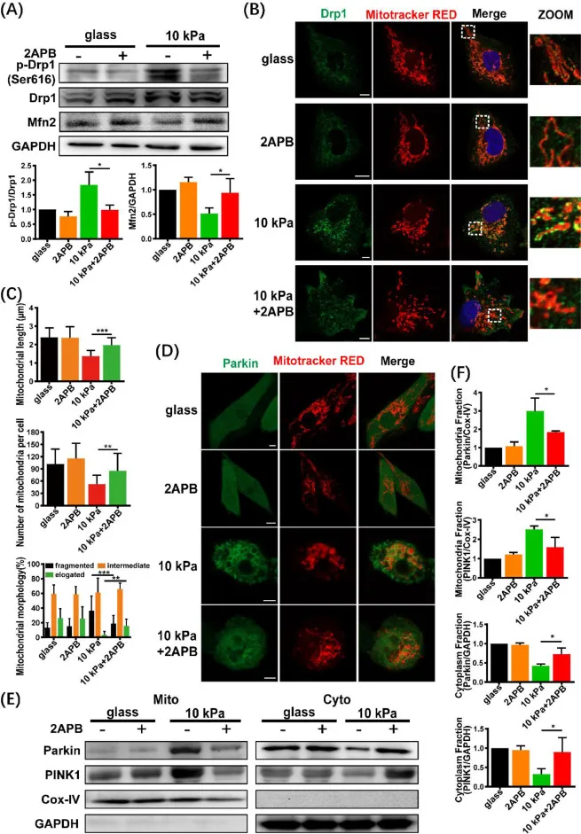 图9 ER-Mito钙转运介导线粒体裂变和线粒体吞噬。MDA-MB-231细胞在软(10 kPa)或玻璃基底物上培养,没有或存在2APB(50 μM)。线粒体裂变和融合蛋白(Drp1、磷酸化的Drp1-Ser616和Mfn2)的(A)蛋白印迹分析(左)和蛋白表达的定量分析(右)(n=3)。(B)用抗drp1抗体(绿色)、丝裂追踪器红色(红色)和DAPI(蓝色)染色的细胞的代表性显微照片。右边的放大图像显示了Drp1和线粒体共定位的细节。比例尺= 10 μm。(C)柱状图显示了平均线粒体长度(顶部)、线粒体数量(中间)和线粒体百分比,分为碎片、中间和细长形状(D)GFP-Parkin转染后的Parkin(绿色)和线粒体(红色)的代表性图像。比例尺= 10 μm。(E)Parkin和PINK1的Western blot分析。(F)蛋白表达的定量分析(n = 3)。