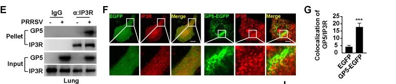 图3 (E)在模拟感染或PRRSV感染的猪肺样本中,通过Co-IP分析来分析GP5与IP3R的相互作用。(F)转染了EGFP-C1和GP5-EGFP的MARC-145细胞,用抗IP3R抗体的免疫染色进行评估(红色)。(G)对(F)中GP5-EGFP与IP3R共定位的定量分析。