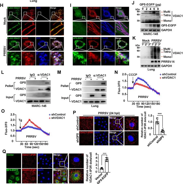 图4 PRRSV GP5与IP3R和VDAC1相互作用(H)用FLAG-VDAC1转染MARC-145细胞24 (H)通过免疫荧光分析检测FLAG-VDAC1、GP5和线粒体(Tom20)的共定位。(I)将FLAG-VDAC1和EGFP或GP5-EGFP质粒共转染MARC-145细胞24 h。通过免疫荧光分析检测FLAG-VDAC1、GP5-EGFP和Tom20的共定位。(J)采用免疫印迹法分析VDAC1寡聚物和GP5-EGFP。(K)通过免疫印迹分析分析模拟感染或PRRSV感染的猪肺样本中的VDAC1低聚物。(L)通过Co-IP分析GP5与VDAC1的相互作用。(M)在模拟感染或PRRSV感染的猪肺样本中,通过Co-IP分析来分析GP5与VDAC1的相互作用。(N)用PRRSV(MOI = 1)感染sh对照组和shVDAC1 MARC-145细胞24 h后,然后用CCCP(10µM)处理,释放线粒体Ca2+。(P)用PRRSV(MOI = 1)感染sh对照组和shGP5 MARC-145细胞24 h。采用PLA法分析VDAC1与IP3R的相互作用(左图)。右侧显示了每个细胞中VDAC1/IP3R点的相对数量的定量分析。(Q)用载体或GP5-EGFP质粒转染MARC-145细胞24 h。采用PLA法分析VDAC1与IP3R的相互作用(左图)。右侧显示了每个细胞中VDAC1/IP3R点的相对数量的定量分析。
