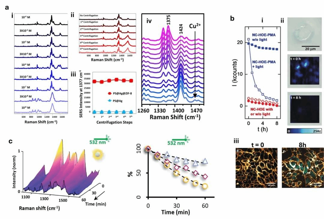 在微米尺度物体操控中,研究人员设计了部分银包覆的二氧化硅微球作为可光学捕获的SERS移动探针,用于细胞膜的空间扫描检测。在纳米尺度操控中,通过光学聚集多个金属纳米颗粒形成动态热点,显著提升了SERS信号。