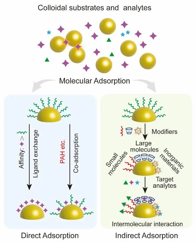胶体金/银纳米颗粒易于合成、重现性好且能提供强等离激元效应,是最广泛使用的SERS基底。然而,利用胶体基底进行SERS测试时,确保目标分子特异性吸附在信号增强最有效的“热点”区域是一大挑战。目标分析物可通过直接或间接机制吸附到等离激元基底上(图1),这可通过修饰胶体颗粒的表面化学性质来控制。