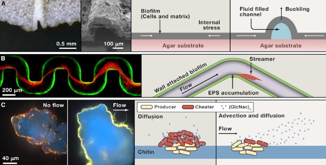 在被膜中,细胞聚集成三维结构,并分泌丰富的胞外基质(EPS),形成力学上的“微生态系统”。其中: