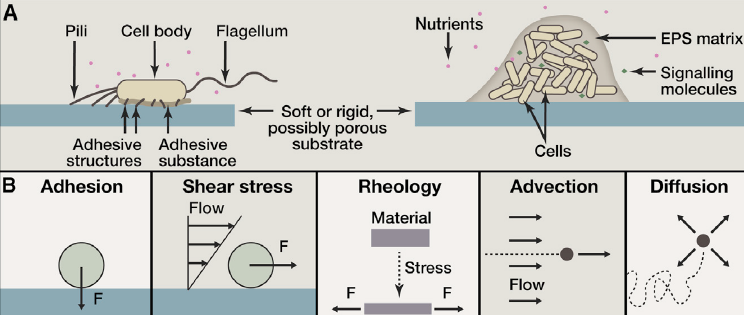 细菌面对表面时,常常发生一种行为转变——从自由游动转变为表面黏附状态,进而进入生物被膜(biofilm)的建立阶段。这一过程被称为附着转化(surface sensing),其背后有明确的力学驱动机制。
