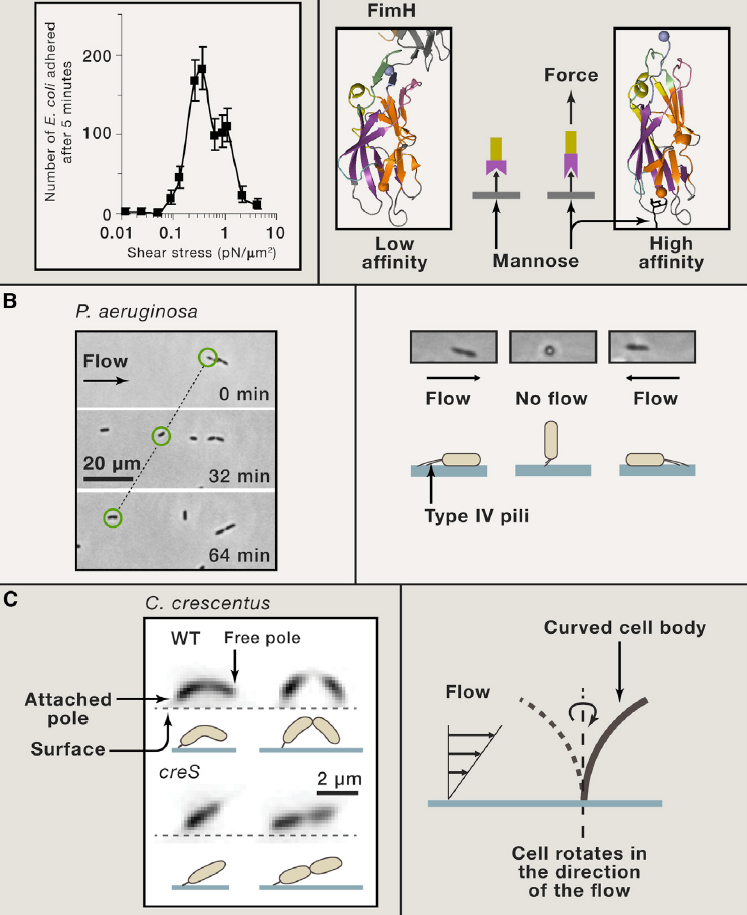 某些细菌表面的外膜蛋白和黏附素(如FimH)可在黏附时产生力学反馈,调节信号传导(例如通过c-di-GMP水平影响表型转化)。