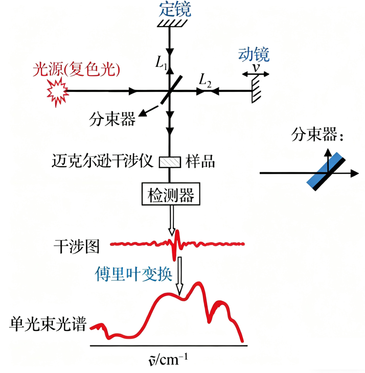 红外光谱使用的是宽频光源(如氙灯、红外灯等),样品透过或反射后,通过干涉仪和探测器分析光的吸收程度。(图6)