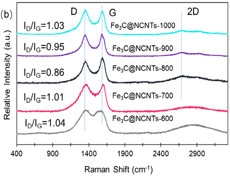 图8. 600-1000 ℃合成的Fe3C@NCNTs的拉曼光谱。DOI:10.1016/j.cej.2019.122004
