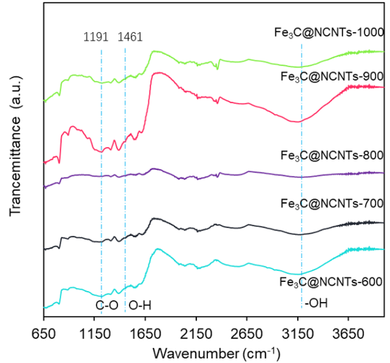 图9. 600-1000 ℃合成的Fe3C@NCNTs的FTIR红外光谱。