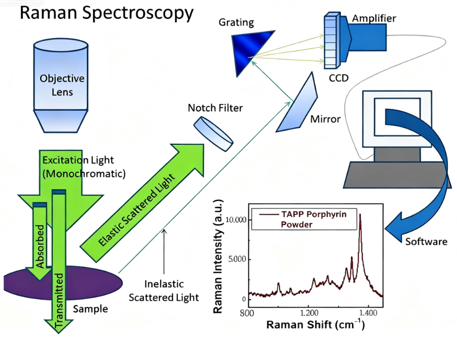 拉曼光谱使用的是单色激光(通常是532 nm、633 nm 或 785 nm等),打在样品上后收集散射光,并用光谱仪分析拉曼位移由于拉曼信号极弱(只有百万分之一左右的散射光发生拉曼位移),所以对光源稳定性、透镜收集效率要求更高。(图7拉曼装置图)