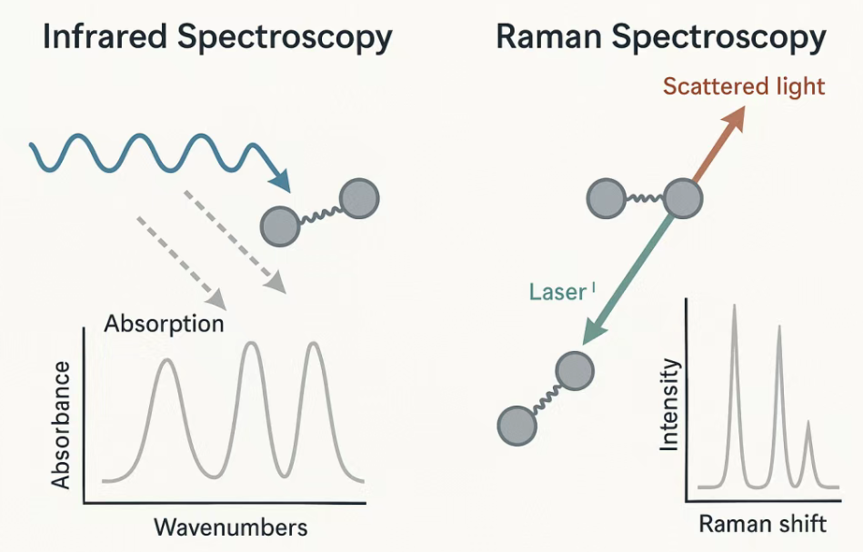红外光谱与拉曼光谱同属于分子振动光谱,但红外光谱是吸收光谱,拉曼光谱是散射光谱,两者机制不同,但互为补充(图1所示)。红外是看“光没了多少”;拉曼是看“光偏了多少”。