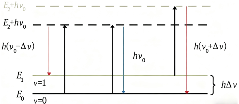 当入射光子hʋ。和处于低能级EN的分子作用时,可以使分子向上跃迁到虚能级EA,再向下跃迁到高能级EM,发出散射光子ʋ’,则