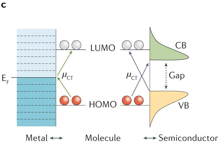 图3. (c)金属–分子或半导体–分子界面的电荷转移(CT)对SERS的贡献:CT跃迁(μCT)及箭头(绿色:金属→分子;紫色:半导体→分子)表示电荷转移方向。红色和白色圆圈代表分子轨道。CB:导带;EF:费米能级;HOMO:最高已占分子轨道;LUMO:最低未占分子轨道;VB:价带。