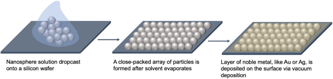 基底需先用食人鱼溶液或王水清洗处理,以去除有机或金属污染物(避免干扰纳米球自组装);随后在基底表面气相沉积金、银等等离激元材料—金属膜的厚度与粗糙度直接关联LSPR特性及整体SERS增强效果。尽管这类基底的增强因子存在批次差异,但其保质期较长,是长期SERS应用的实用选择。