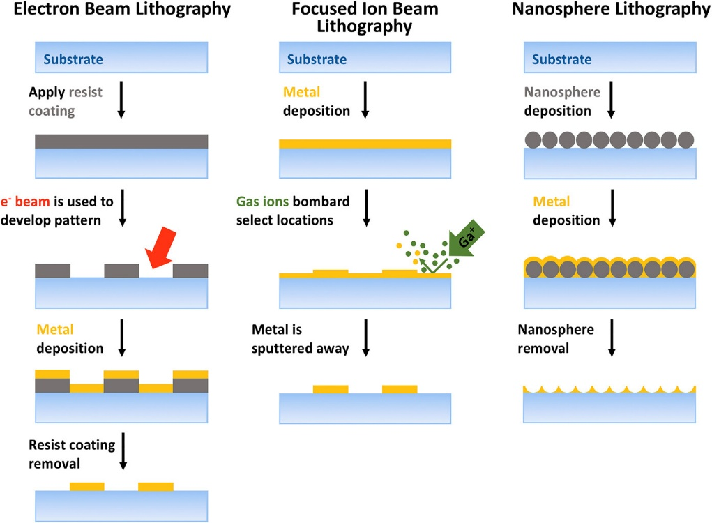 图7. 三种不同光刻技术制备等离激元纳米颗粒阵列的步骤示意图。DOI: 10.1021/acs.chemrev.8b00341