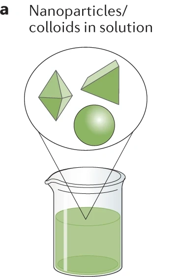 图5. (a)液相胶体纳米颗粒:通过改变反应物和/或表面活性剂,可获得不同尺寸与形貌的颗粒。