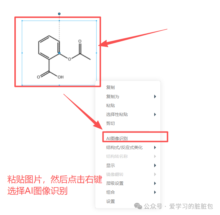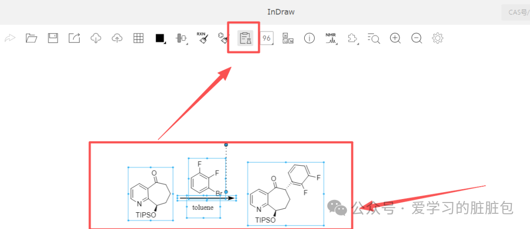 在InDraw左侧工具栏中有许多化学结构式,我们在绘制简单化学结构时就可以通过简单操作,绘制出目标结构了,而且,把鼠标放在工具上,会自动跳出中文的功能介绍另外,我们截取文献或图片中的化学结构式,InDraw可一键识别,即使是复杂的手性化学结构图,InDraw也可快速识别出来,如下图准确率高达99%。InDraw也可快速截取当前页面的结构,就是在文献中看到一个结构我们还可以去查找目标结构的CAS号或中英文名称,indraw也支持一键导入化学结构式,甚至可以识别部分中文俗名。绘制结构式后InDraw 和ChemDraw相同,都可直接复制,粘贴到Word、PPT中,双击PPT中的结构式即可在InDraw中编辑和修改。