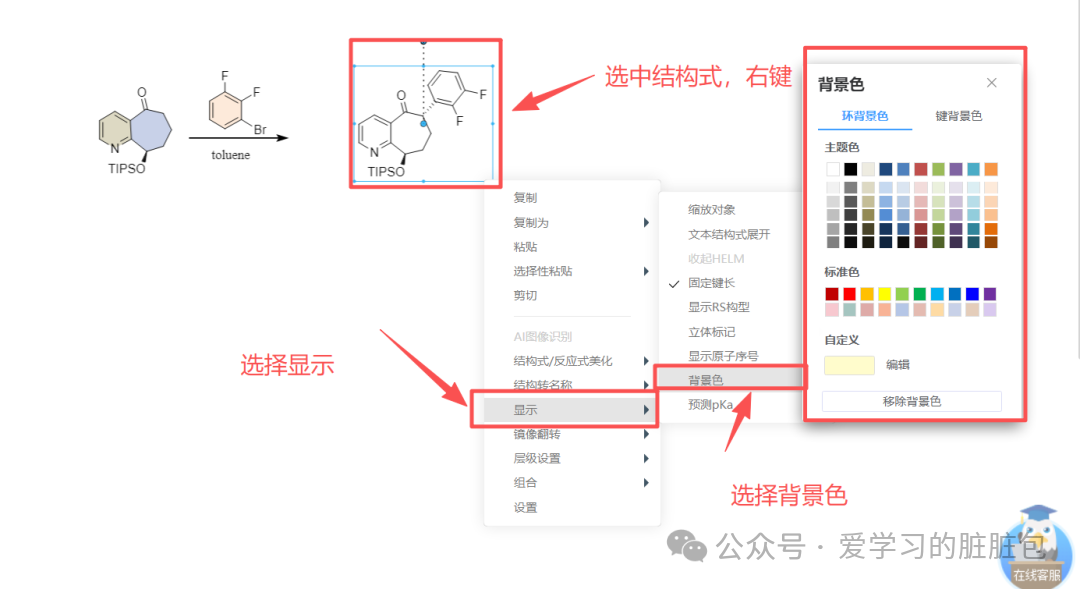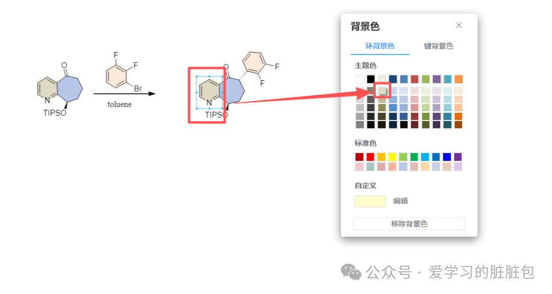 InDraw 还可以给环和键添加背景色,使结构更加美观InDraw这款软件还是很不错的,国产软件进步很大,有些功能虽不及ChemDraw,但是总体还是很不错的,对新手更加友好,而且还有强大的图像识别能力,能减轻不少工作量。