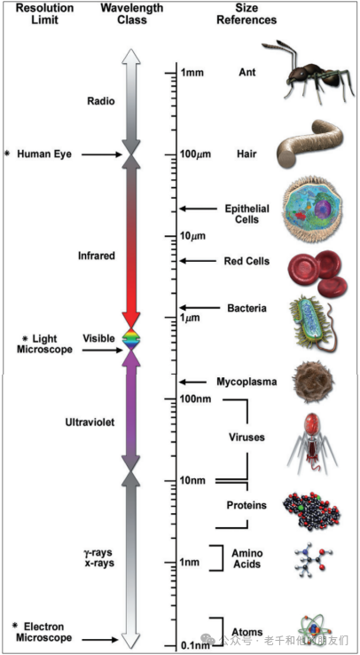 图 3电磁波谱。图中显示了一个对数距离标尺(范围为 1 毫米至 0.1 纳米)。一边显示的是常见电磁辐射的波长范围;另一边显示的是各种细胞和大分子的大小。因此,一个红细胞(7.5 微米)的大小是可见绿光波长(500 纳米)的15倍。此外,还标出了眼睛、光学显微镜和电子显微镜的分辨率极限(*)。眼睛的分辨率极限(0.1毫米)是指在明亮照明条件下,将一张纸放在眼睛前方25厘米处,纸上黑白条纹交替出现的最小间隔。请注意,可见光的波长范围只占光谱的一小部分。
