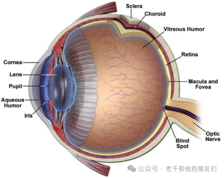 图1人眼的结构。眼睛的角膜和晶状体,将放大的实像聚焦在视网膜上。眼睛显微系统的光圈平面位于晶状体前方的瞳孔中,起着可变光阑的作用。视网膜表面覆盖着大量杆状细胞。3 毫米的黄斑或黄斑上有一个直径为 0.5 毫米的眼窝,这是一个凹陷的坑,包含了视网膜上负责色觉的大部分视锥细胞。