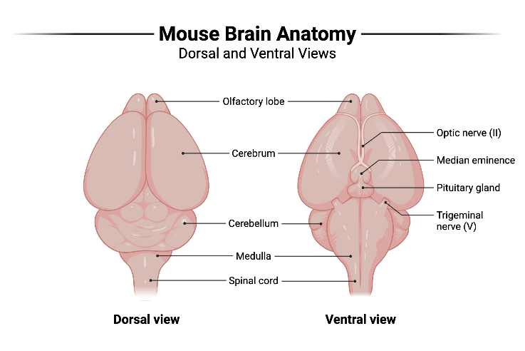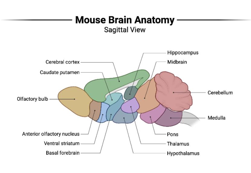 小鼠的大脑从前往后分别是嗅球(Olfactory Bulb)、大脑(Cerebrum)、小脑(Cerebellum)、脑干(Brainstem)。