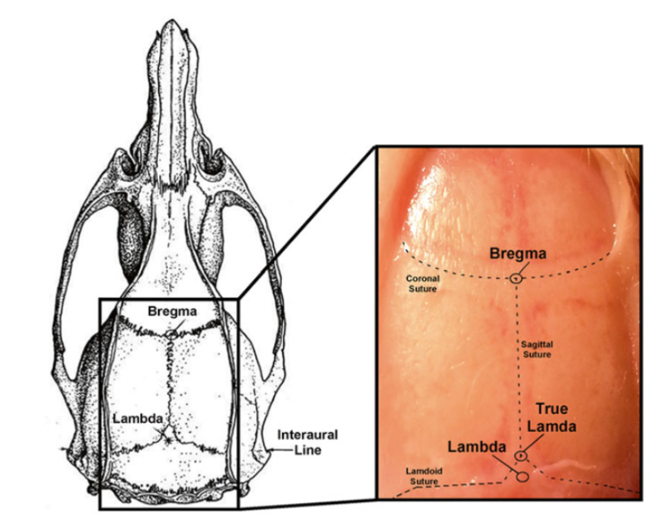 在进行脑立体定位时,首先需要在立体定位仪上准确找到 Bregma。在小鼠颅骨表面识别冠状缝与矢状缝的交点,即为 Bregma。使用探针或针尖轻触该点,并将立体定位仪的读数清零,设定 AP = 0、ML = 0、DV = 0(DV 通常以颅骨表面作为零点,具体以所使用的脑谱图定义为准)。