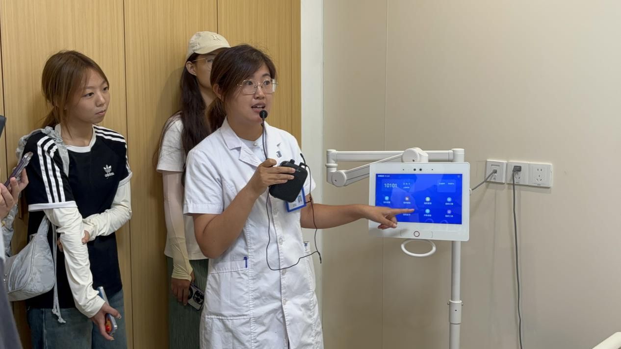 离开院史馆后,一座充斥着现代感的玻璃房赫然出现在新生眼前。这是此次活动的最后一站——国际医学中心。负责人李慧老师向新生介绍了国际医学中心的基本构成以及它所服务的人群,并带新生参观了基于“庭院式居家医疗”理念所建成的极具现代特色的智慧病房以及病房内配备的全屋智能家居系统。