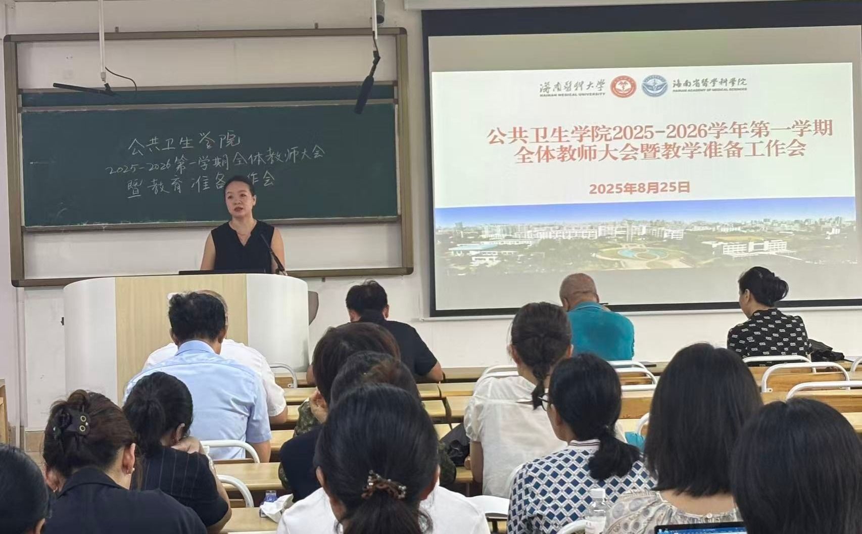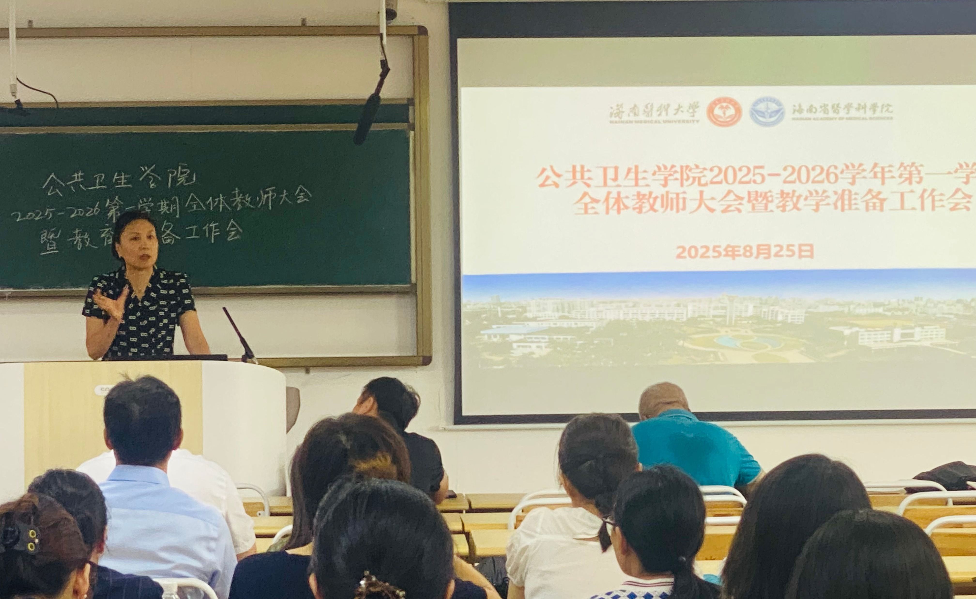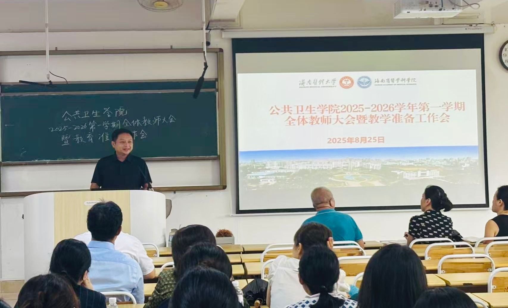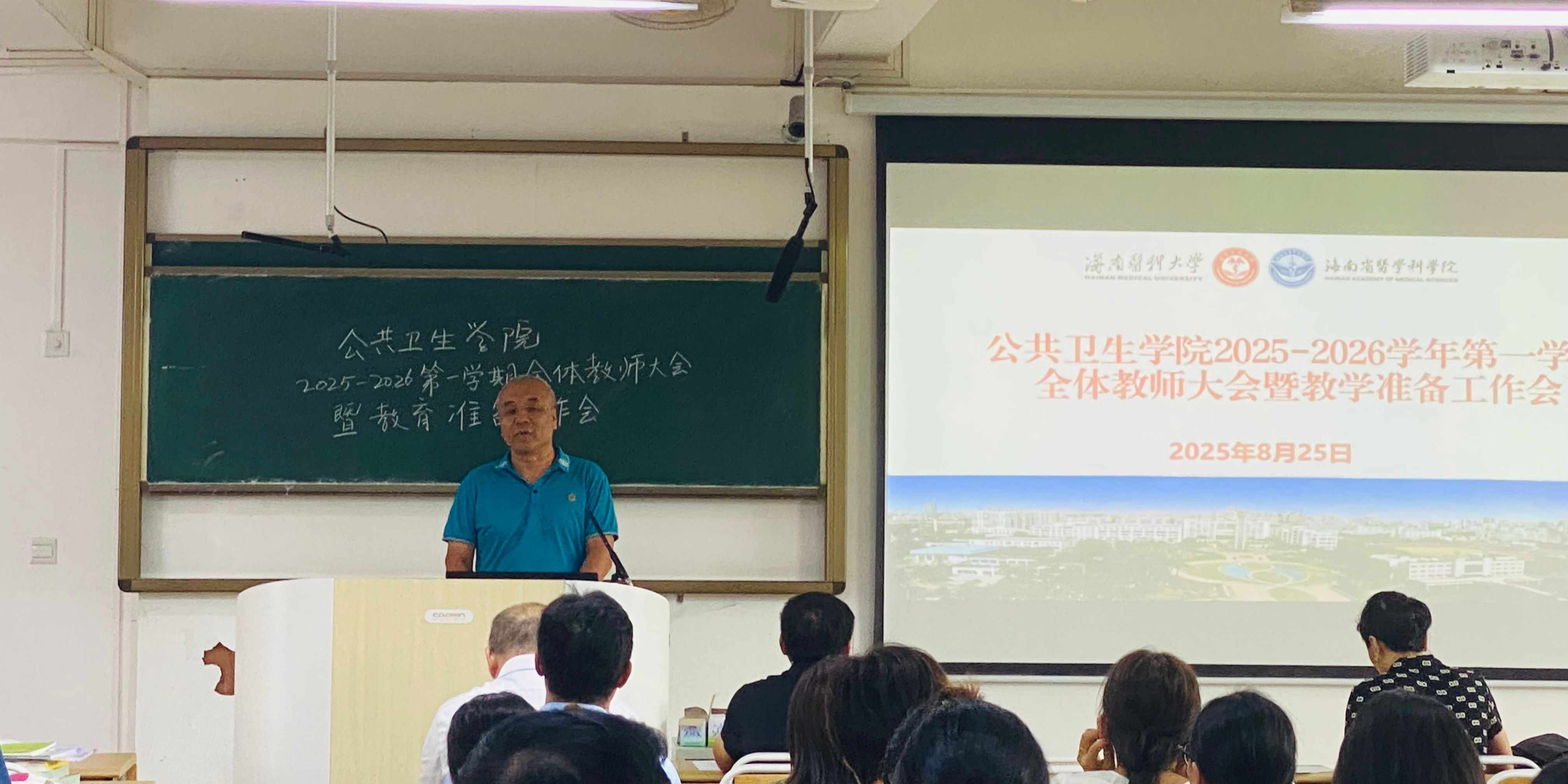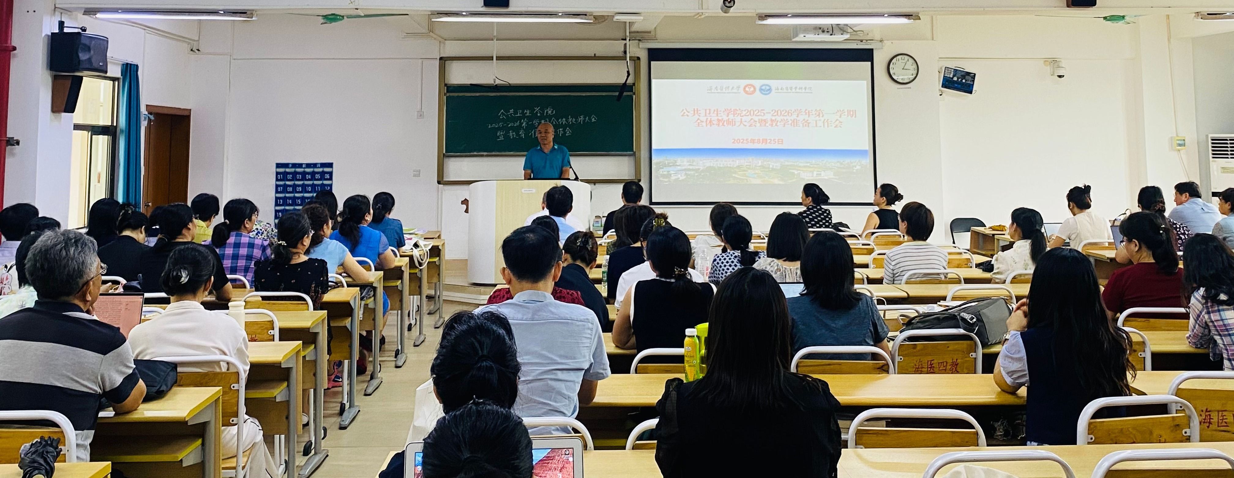 为保障2025-2026学年第一学期教学工作顺利开展,8月25日下午,公共卫生学院召开全院教师大会暨开学教学准备会,部署开学检查工作及新学期教学任务。学院党委书记王明兴、院长杨国静、党委副书记兼纪委书记李伟斯及全体教师参加本次会议。会议由副院长丁金东主持。